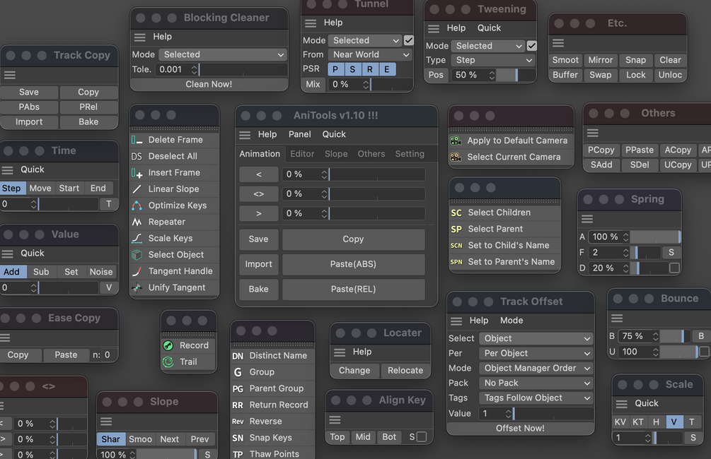 Anitools has dozens of functions plug-ins for motion graphics and character animation.